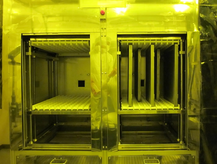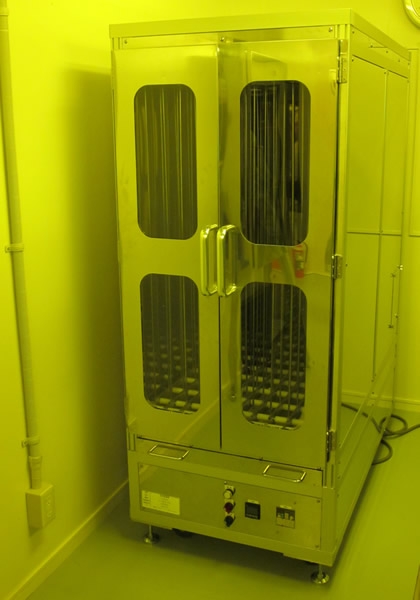 クリーンルーク仕様循環型乾燥機で枠サイズに応じて可変式ラックを搭載。(150mm~1000mm)炉内クリーン化は独自オリジナル機構を採用。